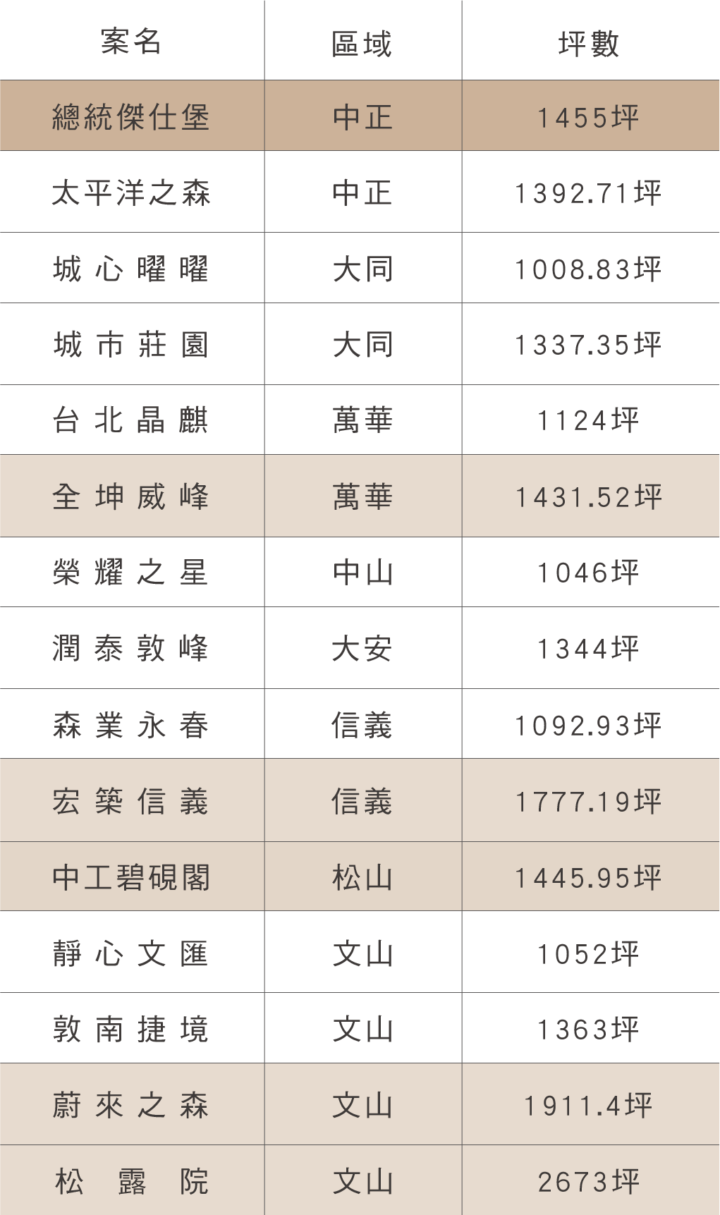 北市近5年來,1,000坪以上基地的推案僅29個。其中超過1,400坪者更是稀缺,含『新光人壽總統傑仕堡』在內僅12案。