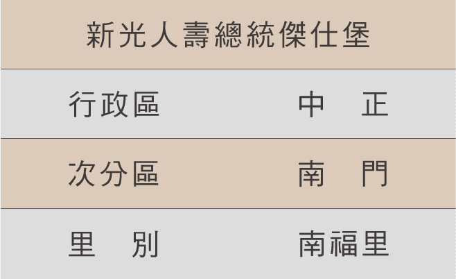 中正區31個里,綜所稅總額最高為「南福里」,總計新臺幣6,110,280元;中位數則為1019(單位:千元)。換句話說,南福里居民人均年收破百萬,實為殷富安康的城區。『新光人壽總統傑仕堡』以巍峨精鑄的地標姿態,會合此地的富裕豐饒。