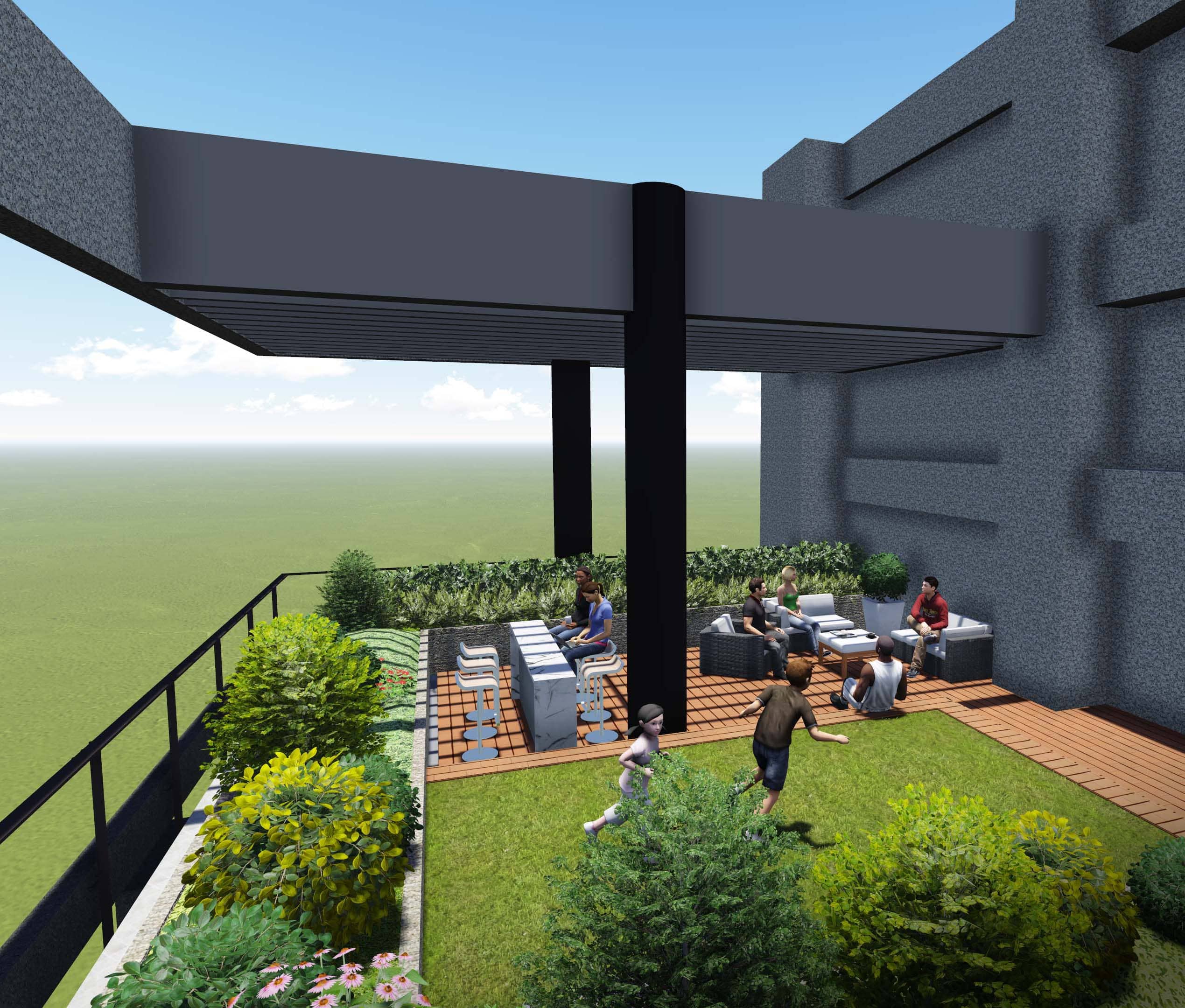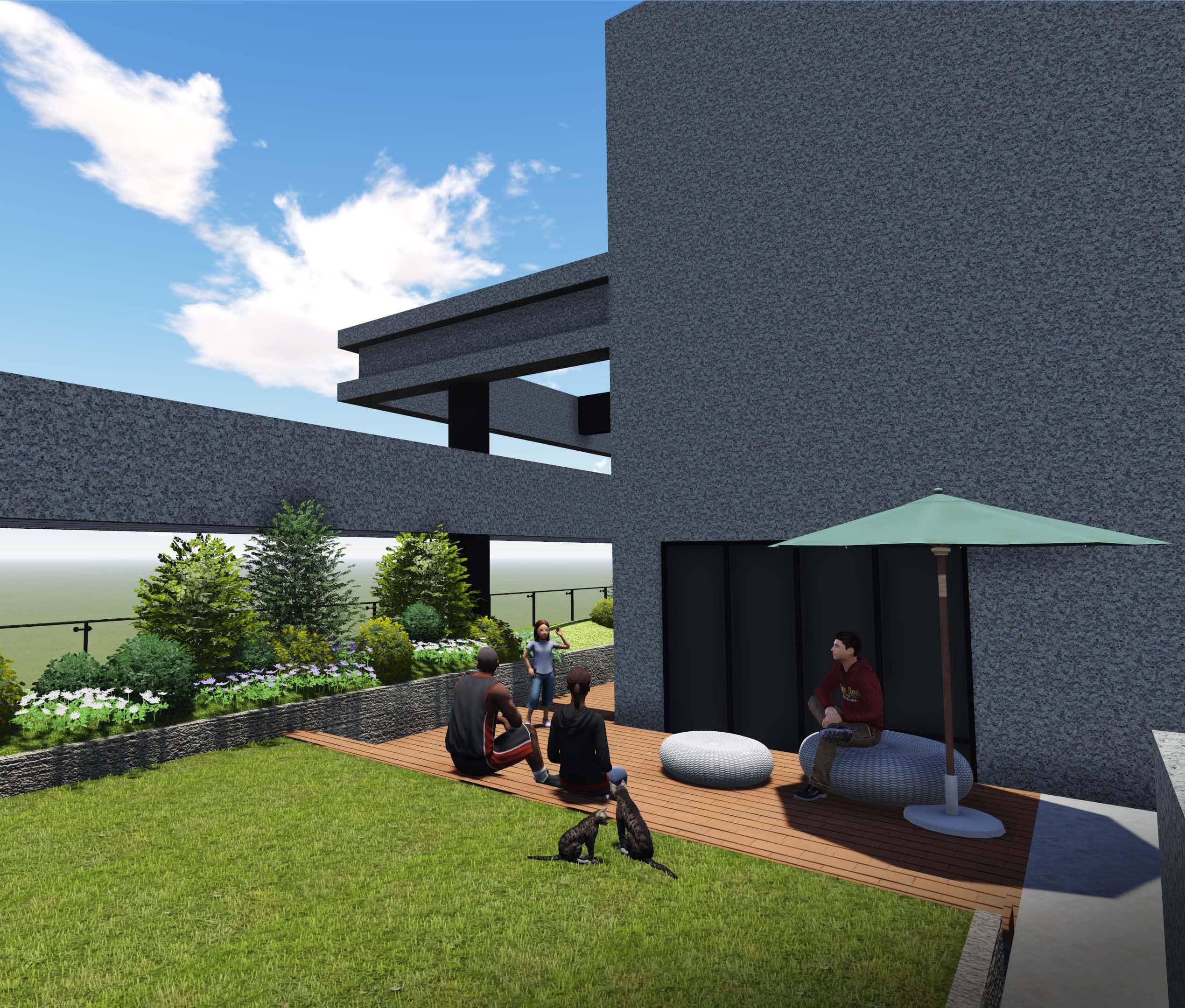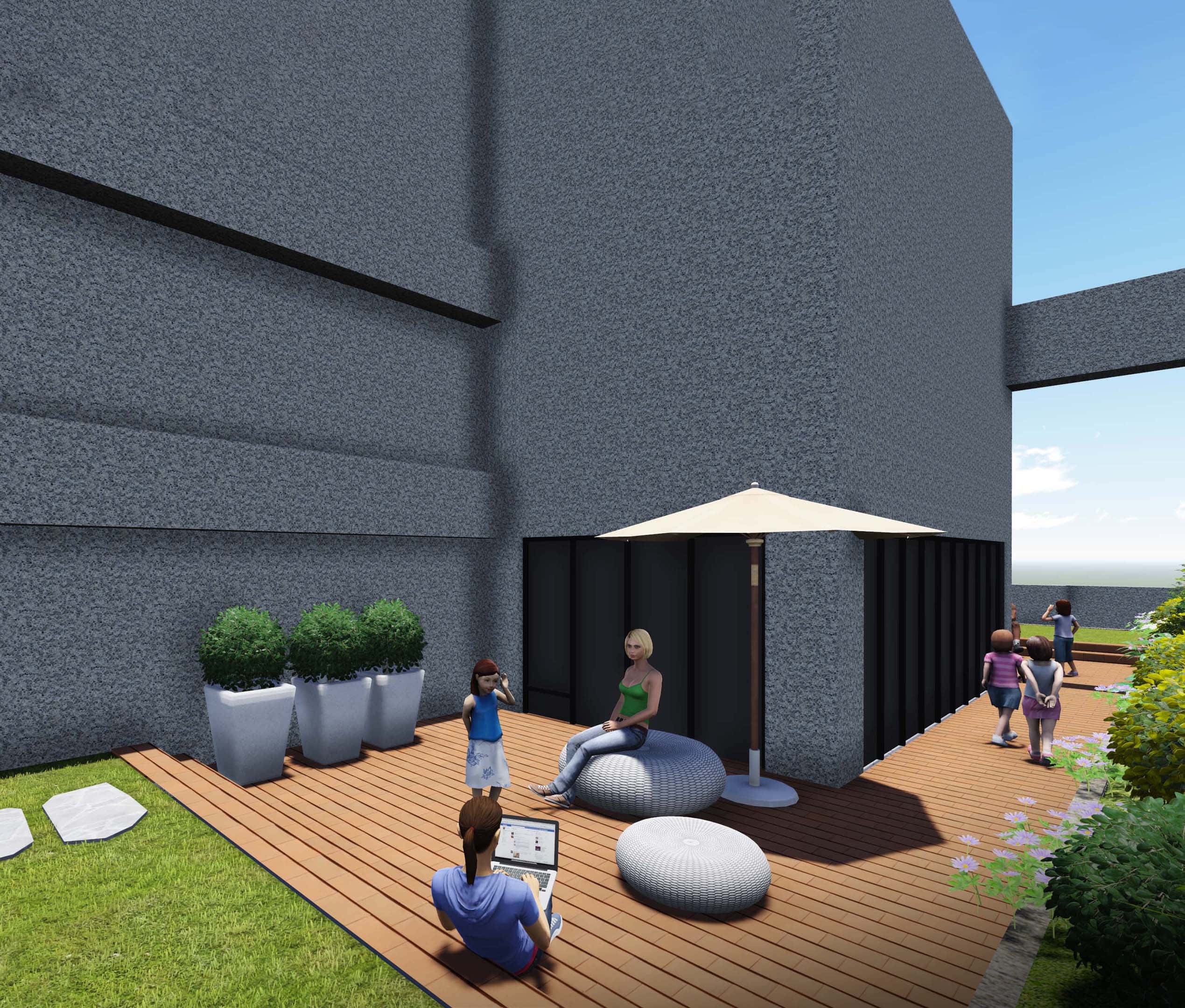 利用綠籬的包覆感,在高空中挹注一種安定氛圍。樹形與人的尺度相當,構成親切和諧的意象。偌大的綠毯草坪配置,則提供孩子們嬉戲的場所。