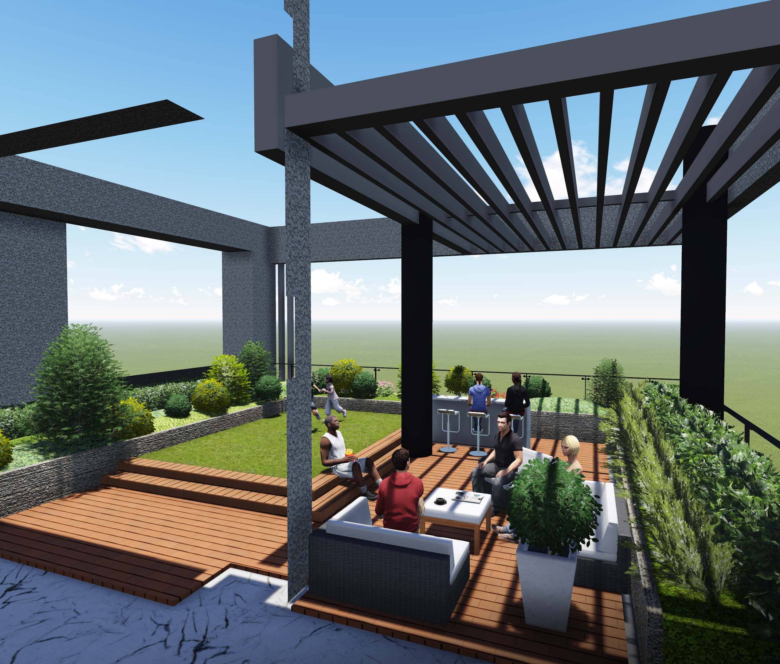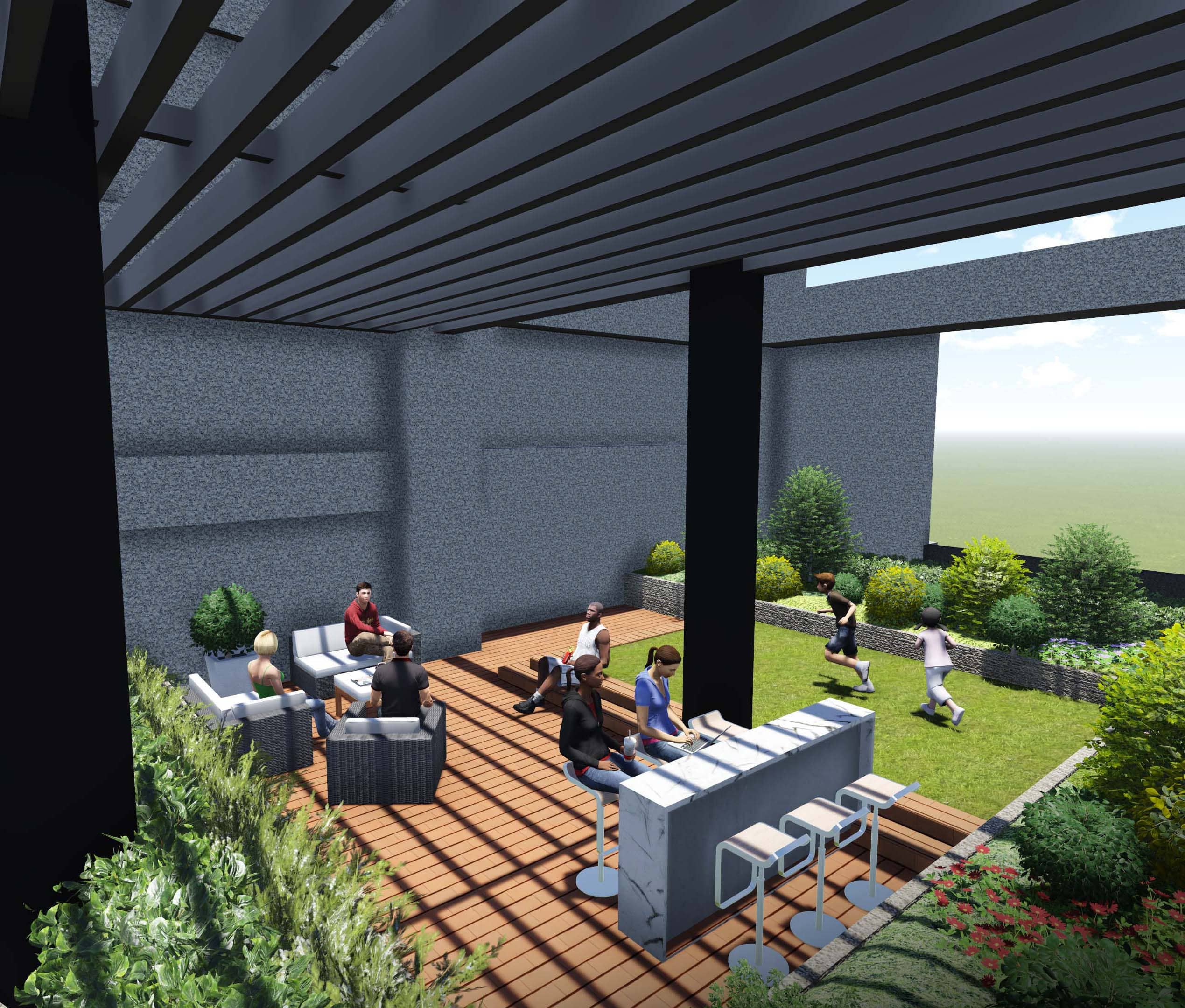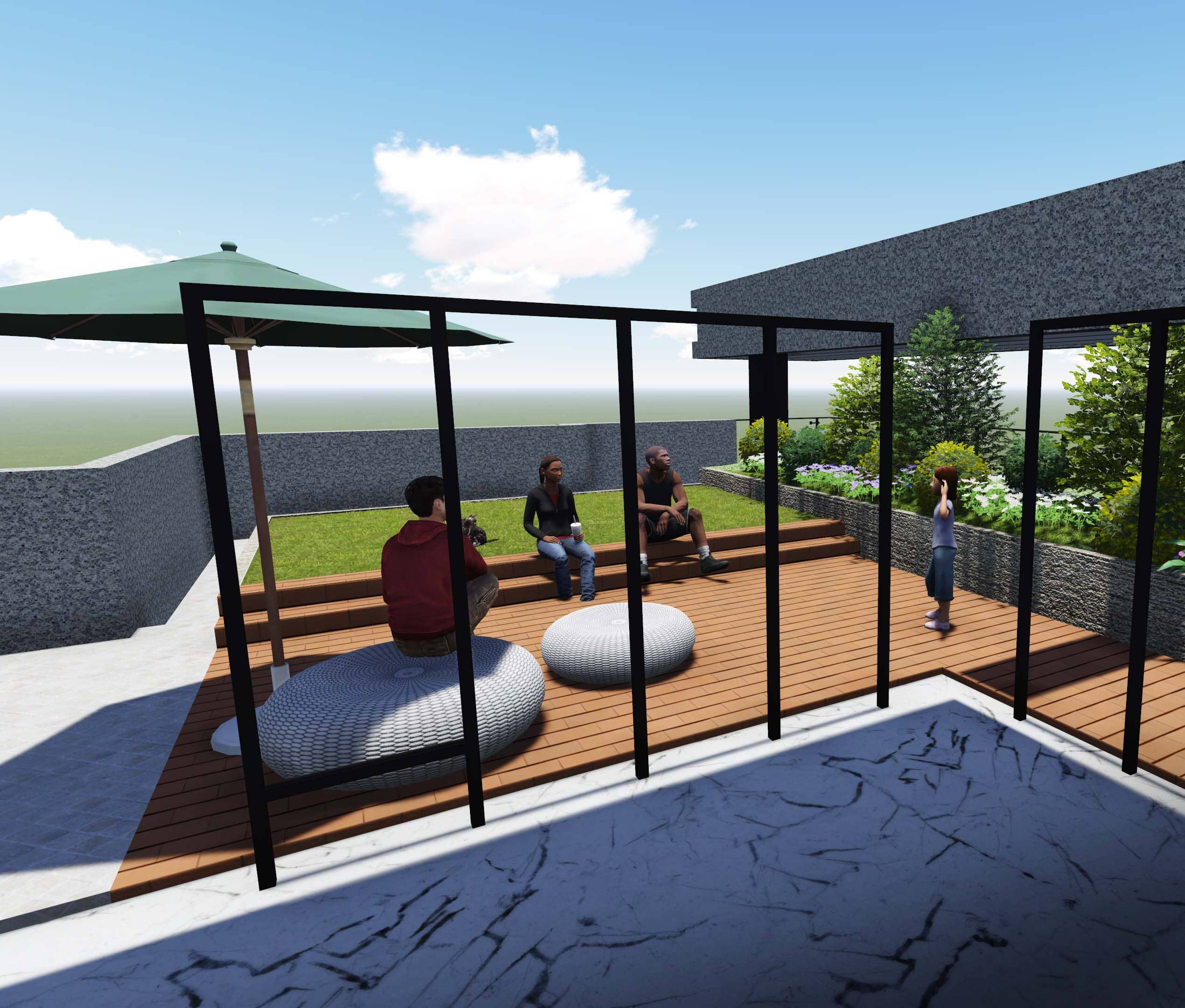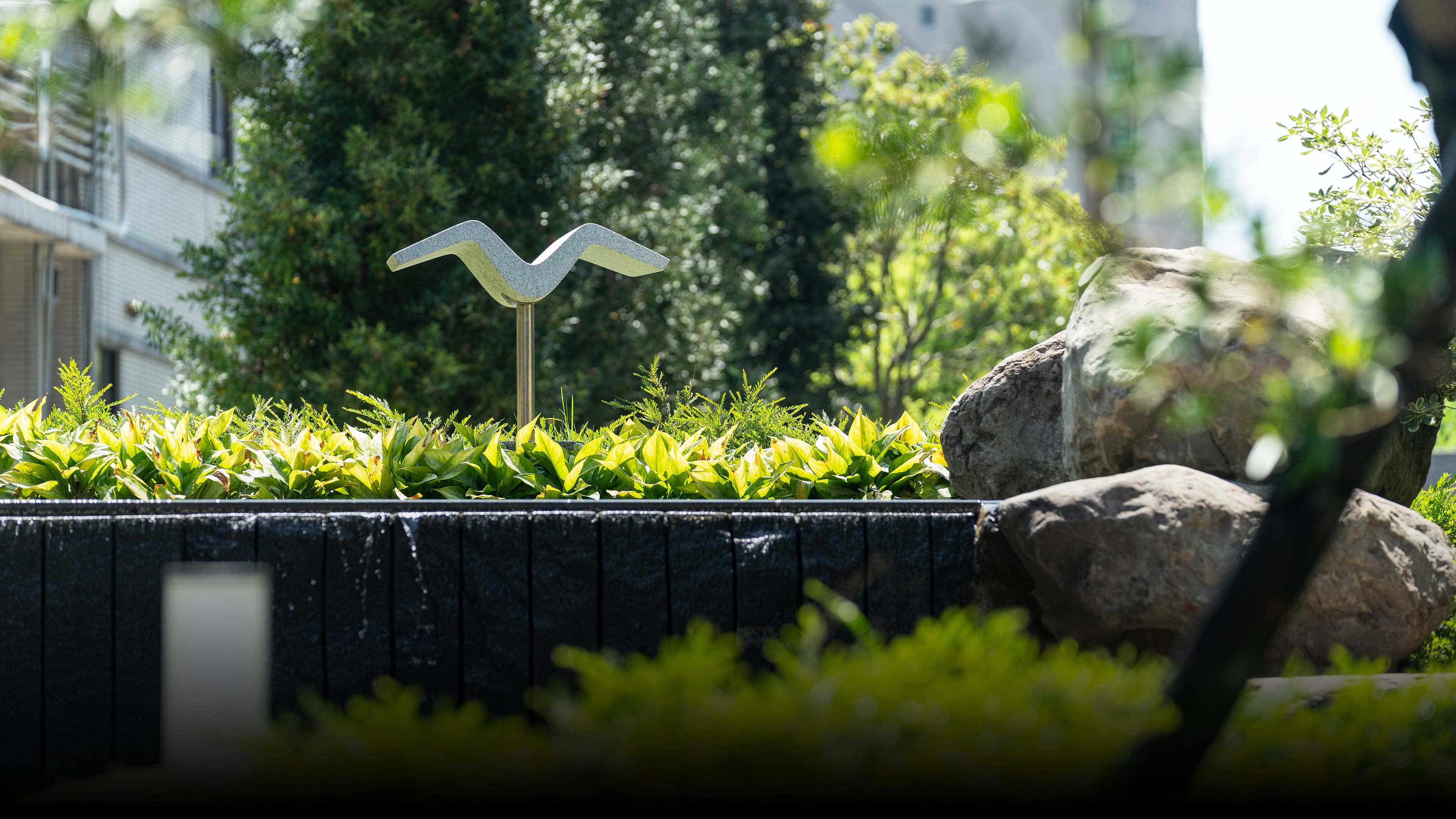 利用綠籬的包覆感,在高空中挹注一種安定氛圍。樹形與人的尺度相當,構成親切和諧的意象。偌大的綠毯草坪配置,則提供孩子們嬉戲的場所。
