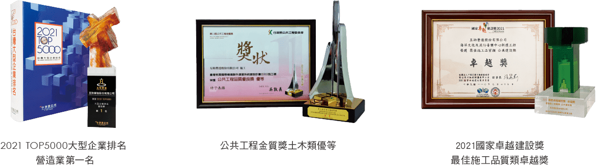 「2009高雄世運會主場館統包工程」第38屆亞太國際營聯會「建築金牌獎」「2009世運會主場館」第9屆公共工程金質獎建築類優等取得OHSAS 18001職業安全衛生管理系統認證「國道六號C606A」第9屆公共工程金質獎土木類優等